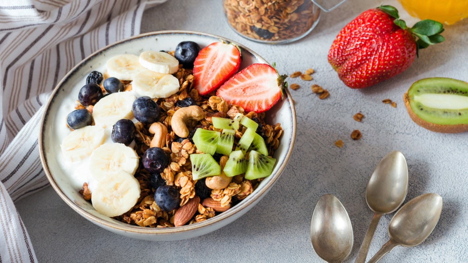 A serving of muesli with raspberries with a banana will satisfy your sweet tooth.
