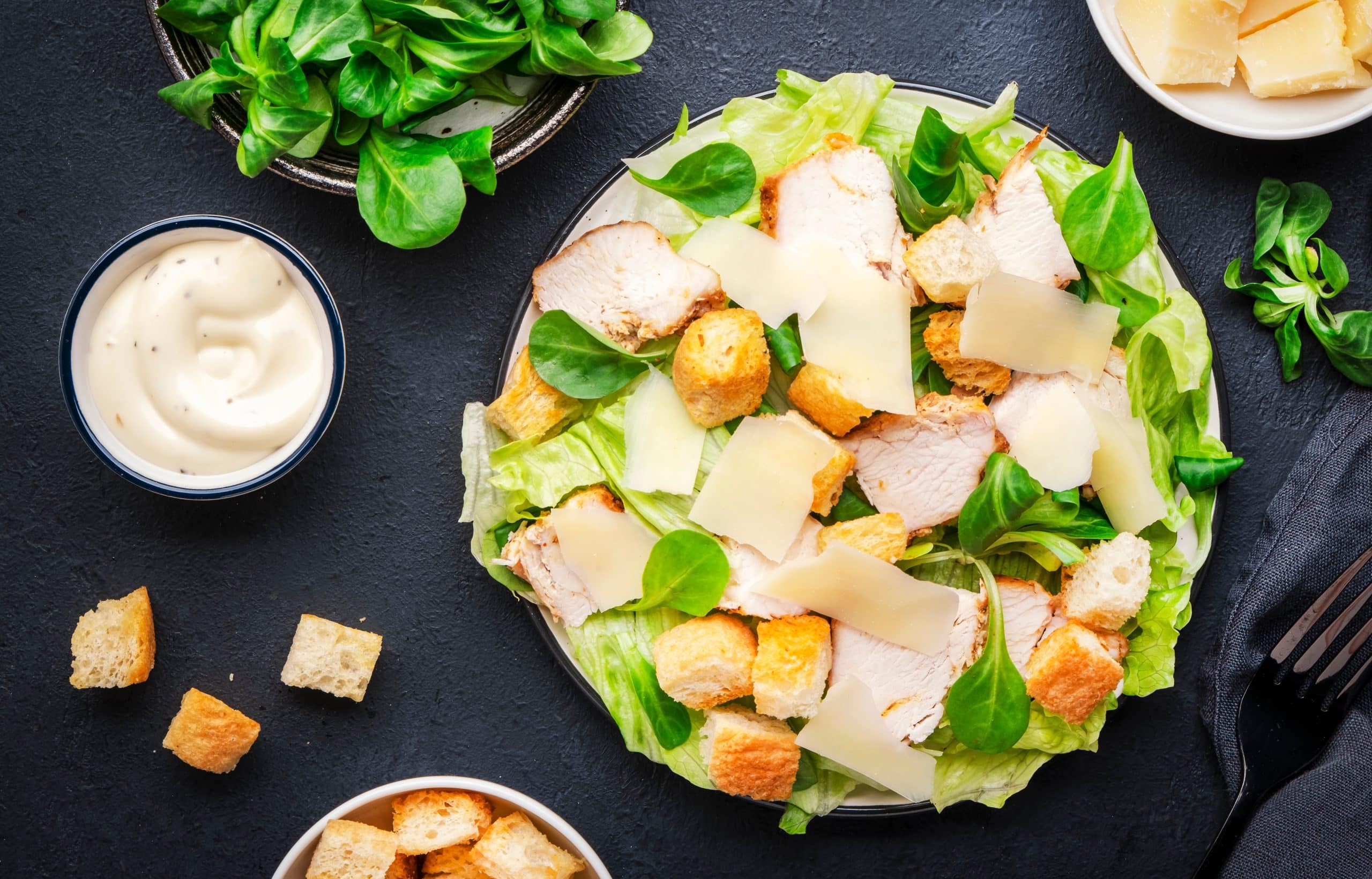 Add a lean protein – Although the parmesan cheese and anchovies (if you choose to use them) contribute some protein, Caesar salad on its own is not a high-protein meal. Add some grilled chicken breast or salmon to boost the protein content and round out your meal.