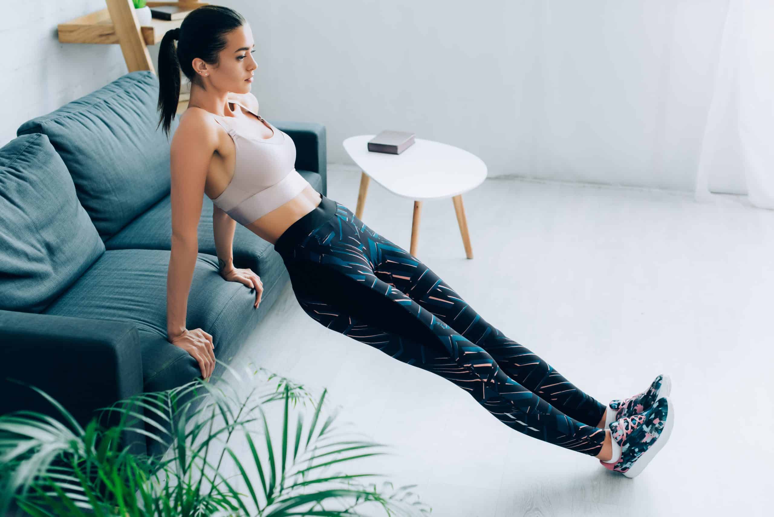 2. Place your hands on the couch beside you, and press down to lift your hips off the couch.