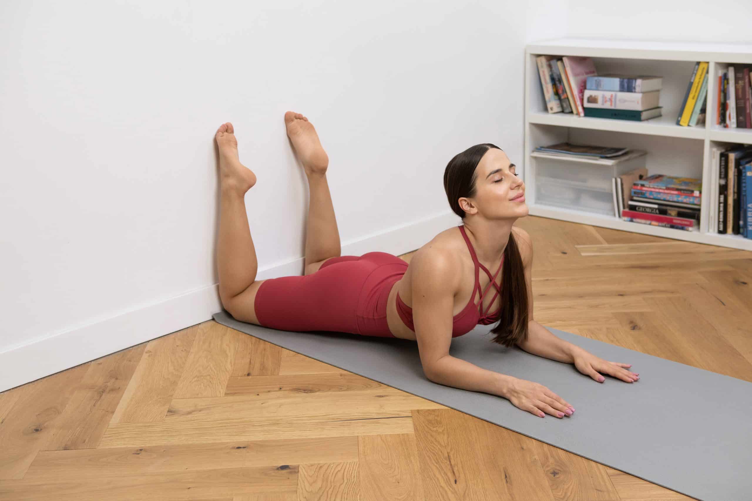 Lie on your back with your feet flat on the wall and knees bent at a 90-degree angle.