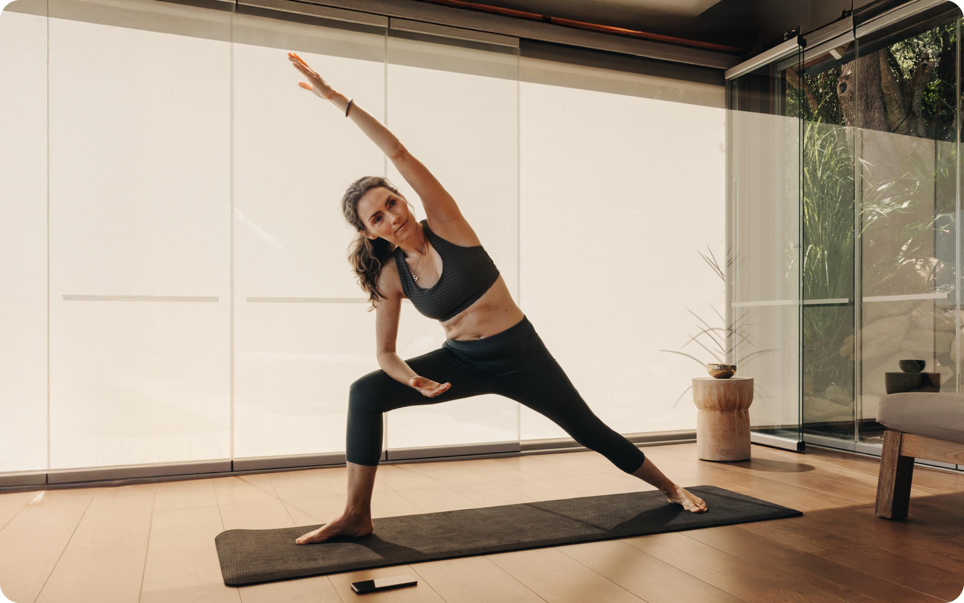 This dynamic variation challenges your balance while opening your chest and shoulders.